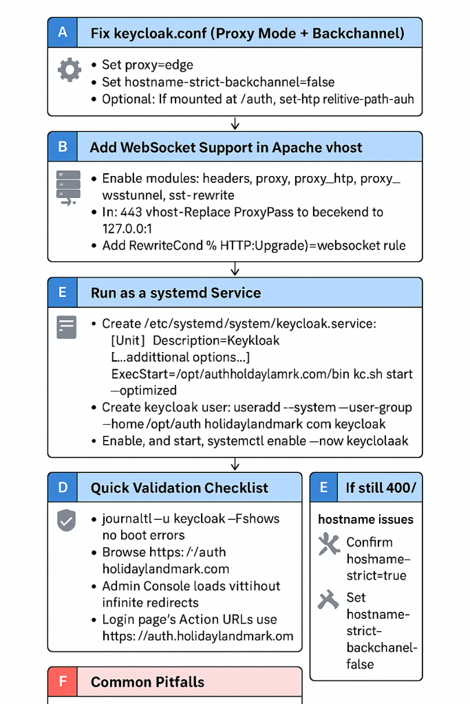 With the above, Keycloak will (a) always run via systemd, (b) serve HTTPS through Apache with proper proxy/WebSocket handling, and (c) behave correctly with proxy=edge