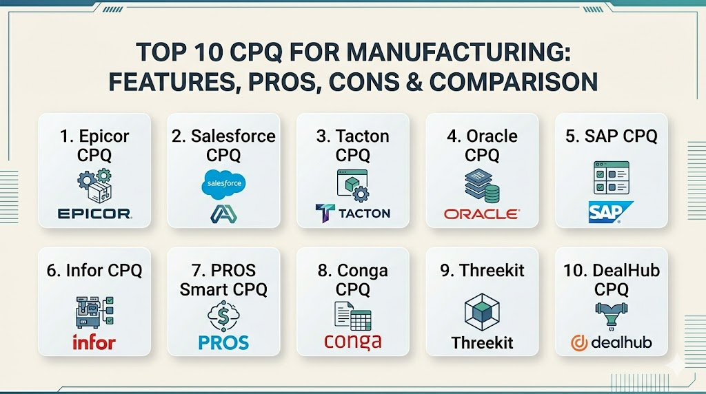 The evaluation of CPQ software for manufacturing focuses on the software’s ability to handle extreme technical complexity while maintaining sales velocity. Epicor CPQ scores exceptionally high because it successfully unifies engineering precision with a modern visual interface. Platforms like Salesforce and SAP score highly on integration and ecosystem, as they are often the “operating system” for the entire enterprise. Meanwhile, tools like DealHub represent the shift toward ease of use, proving that technical power doesn’t have to mean a poor user experience.