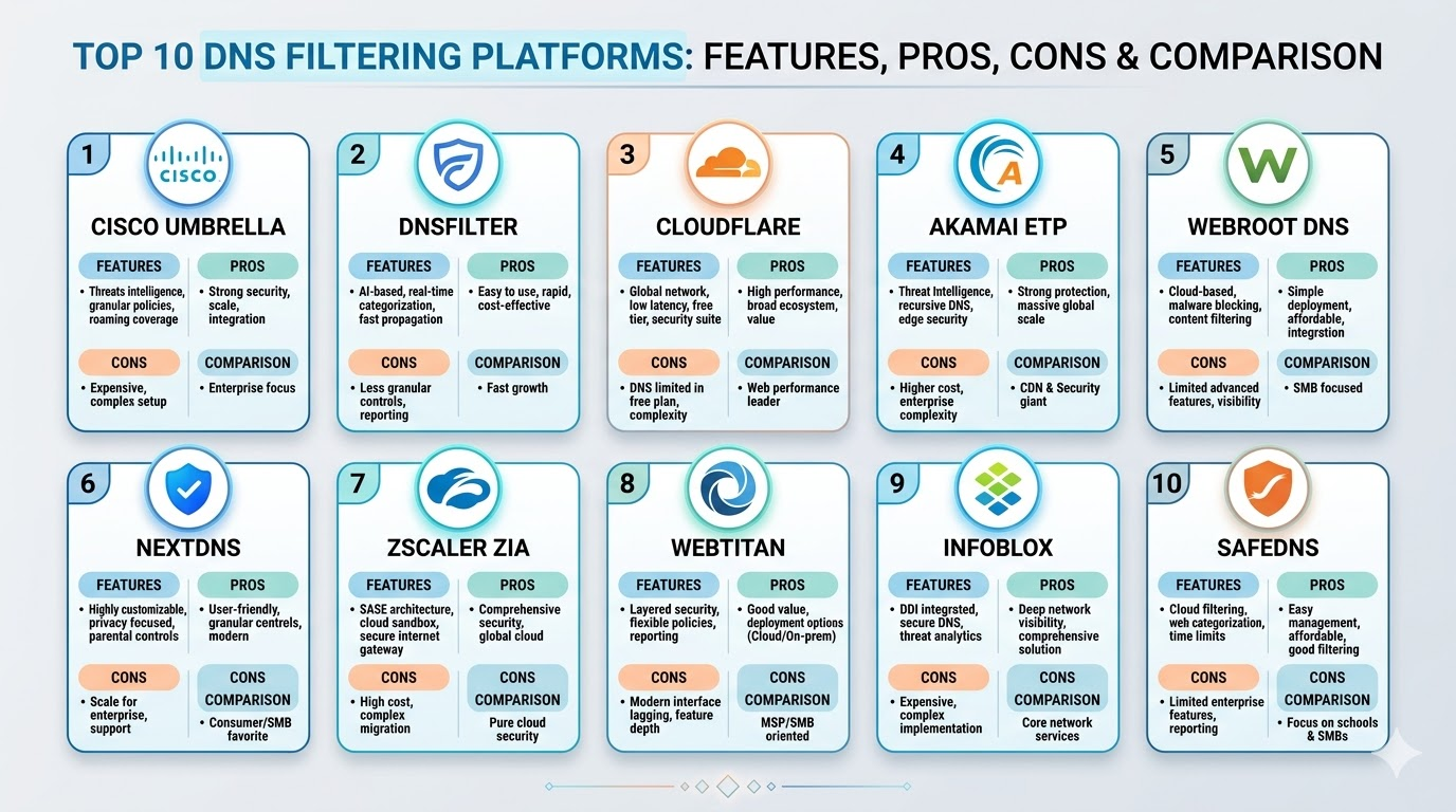 DNSFilter and NextDNS win on ease of use. Infoblox and Cisco Umbrella win on feature depth, offering tools for advanced network analysis that smaller platforms simply cannot match.
