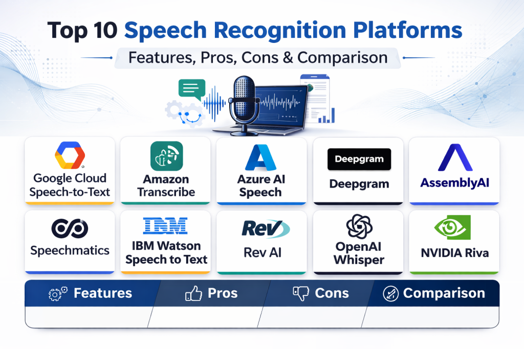 These platforms are now important across customer support, meetings, media, healthcare workflows, legal transcription, compliance review, voice assistants, and analytics. Teams want fast integration, better accuracy in noisy audio, multilingual support, and operational features that help them scale. A good platform is not only about transcription quality. It must also support deployment, security, integrations, monitoring, and developer productivity.