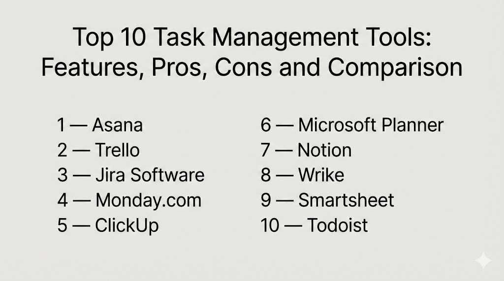 Task management tools succeed when they create daily clarity, not when they add more complexity. The right choice depends on how your team works, how much reporting you need, and how disciplined you want to be with templates and governance. If you need cross-functional visibility and structured delivery, tools like Asana, Monday.com, Wrike, and Smartsheet can fit well. If your work is engineering-led with backlogs and structured workflows, Jira Software can be a strong backbone. If you want lightweight adoption for visual workflows, Trello can be enough. For personal productivity, Todoist works well when you value speed and focus. A practical next step is to shortlist two or three tools, run a small pilot using a real project, validate adoption and reporting, and then standardize templates and permissions before scaling.